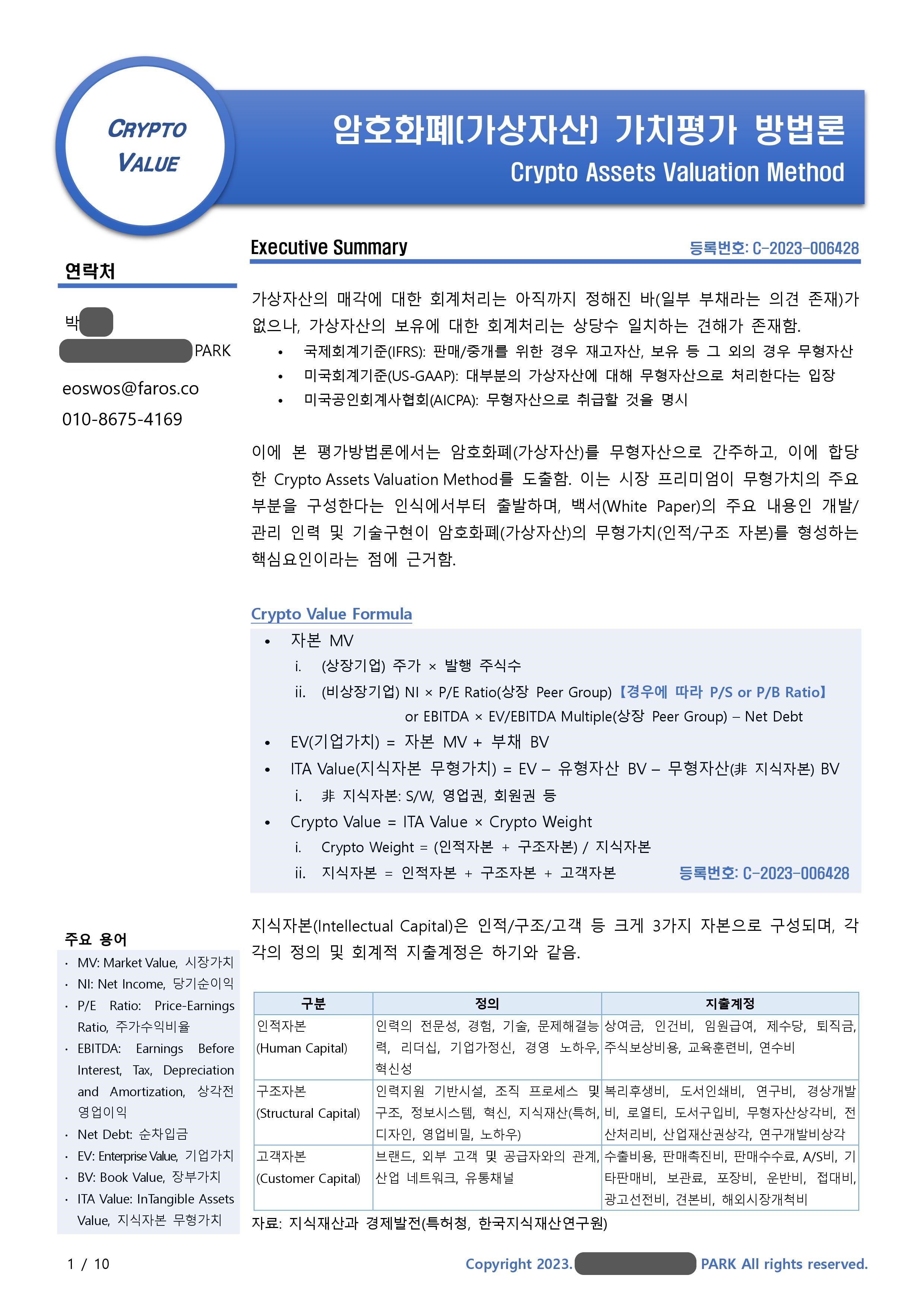 암호화폐(가상자산) 가치평가 방법론 (Crypto Assets Valuation Method)_저작권 등록 [방법론] 암호화폐(가상자산) 가치평가 방법론 안녕하세요. 20년을 넘게 Valuation 업무를 지속해 오고 있는 Veteran Alfaro
