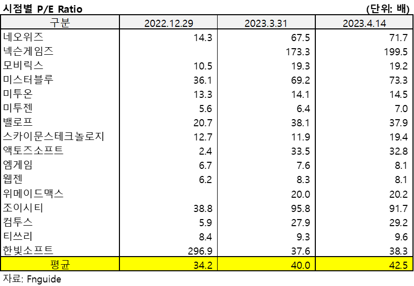 이렇게 정리되면, 그 다음 차례는 자본MV(시가총액)를 구해야 하는데요. (주)수퍼트리가 증권시장 상장사가 아니므로 적절한 Peer Group을 선정해야 합니다. 제가 보기에는 코스닥에 상장된 "게임엔터테인먼트" 업종이 적절해 보입니다. 그래서 해당 업종의 상장사를 List up 해봤습니다.